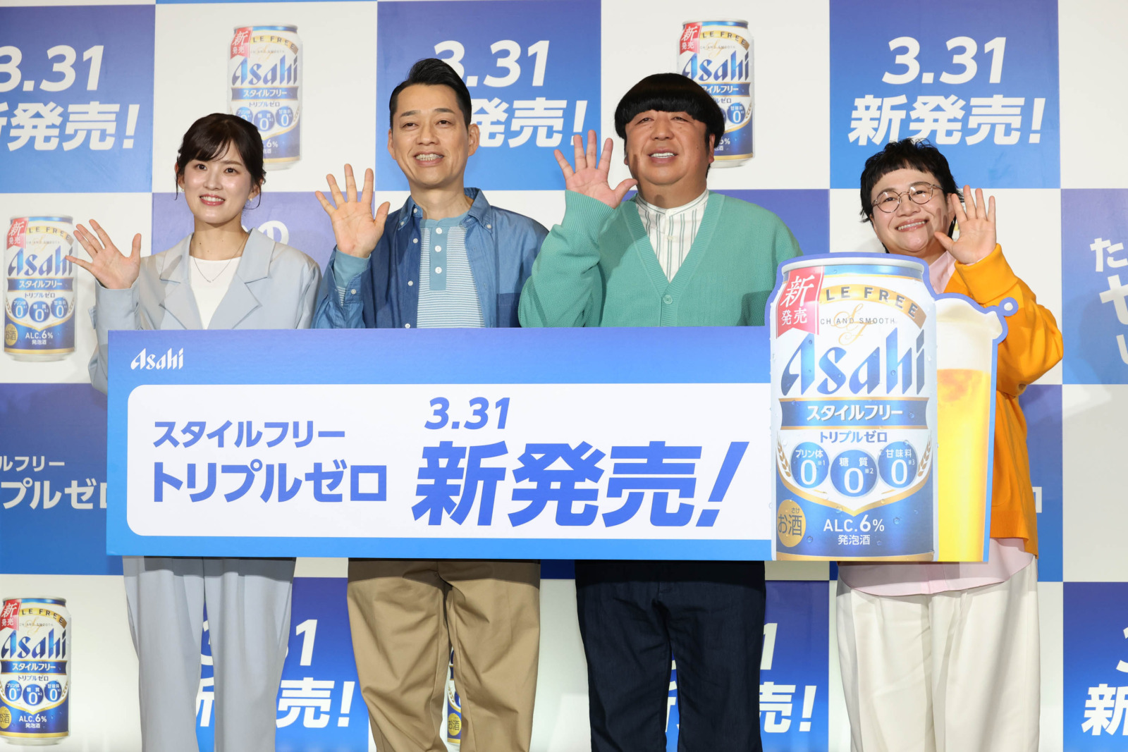 バナナマン・設楽統、日村勇紀 ハリセンボン・近藤春菜 アサヒスタイルフリー新商品「トリプルゼロ」発表会(2026年3月26日=都内 撮影:小川安栄)