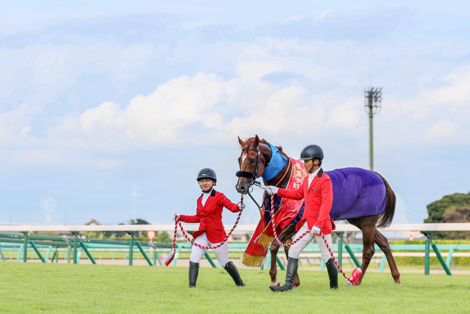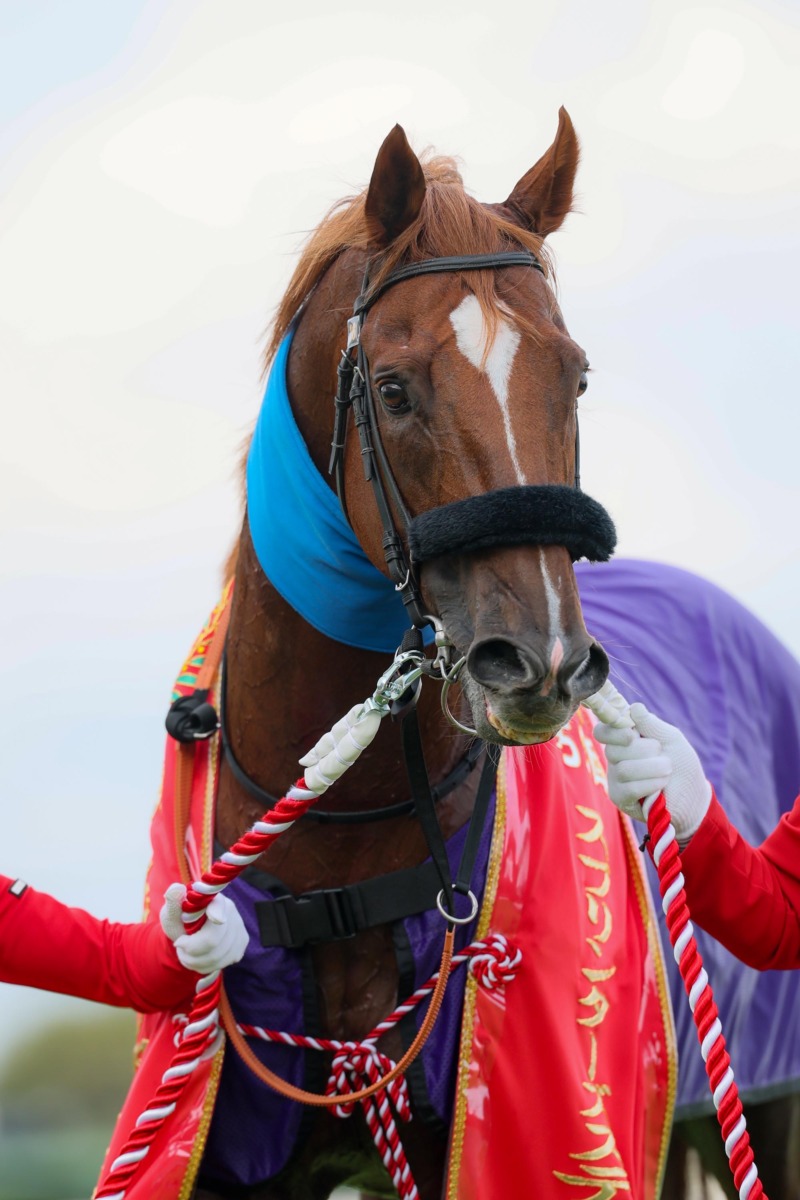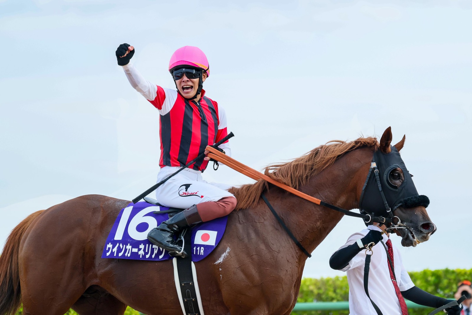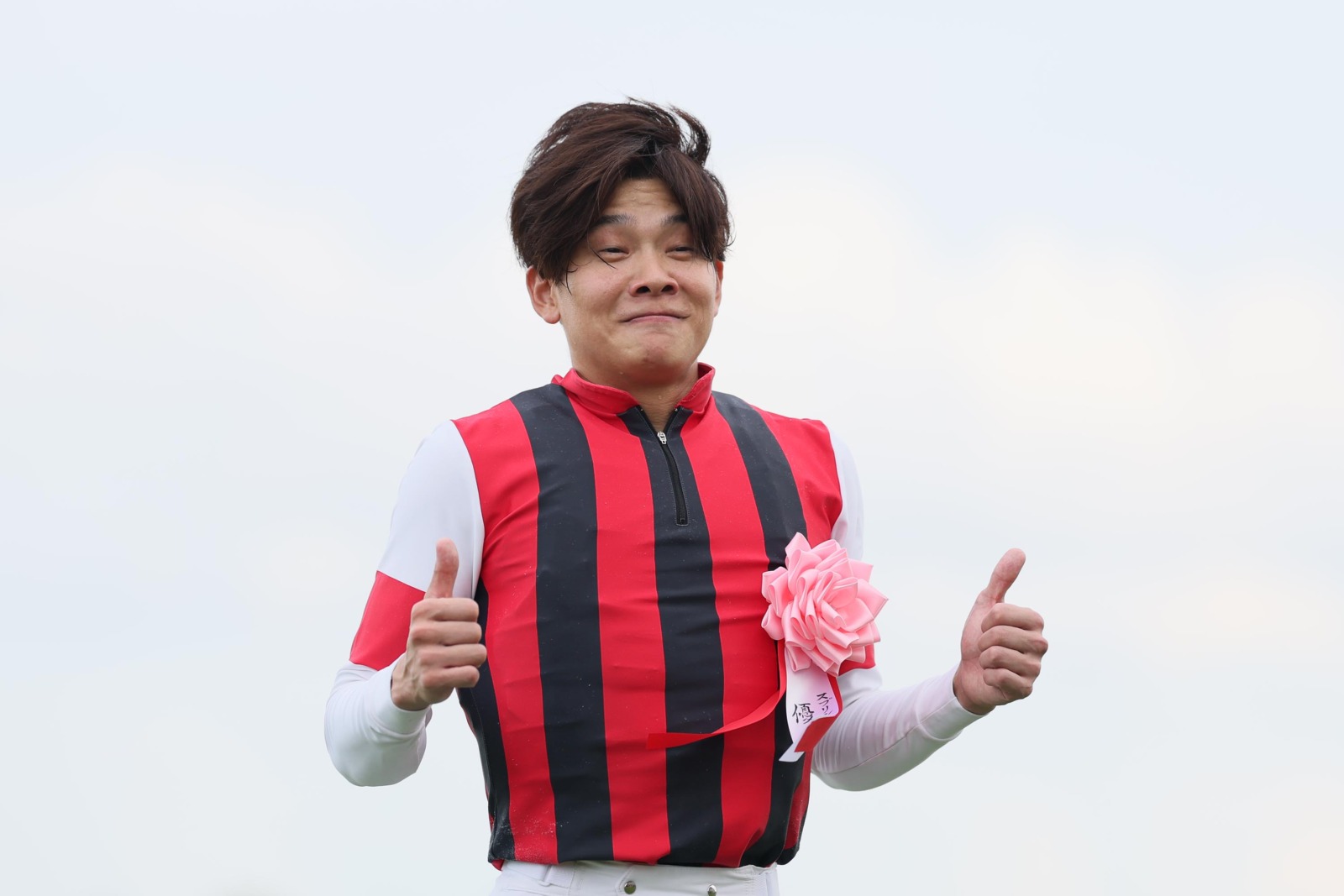 勝利騎手インタビューでポーズをとる