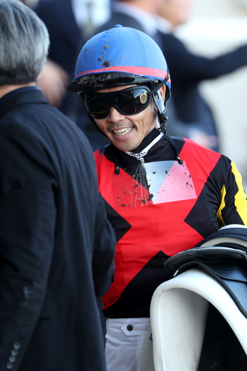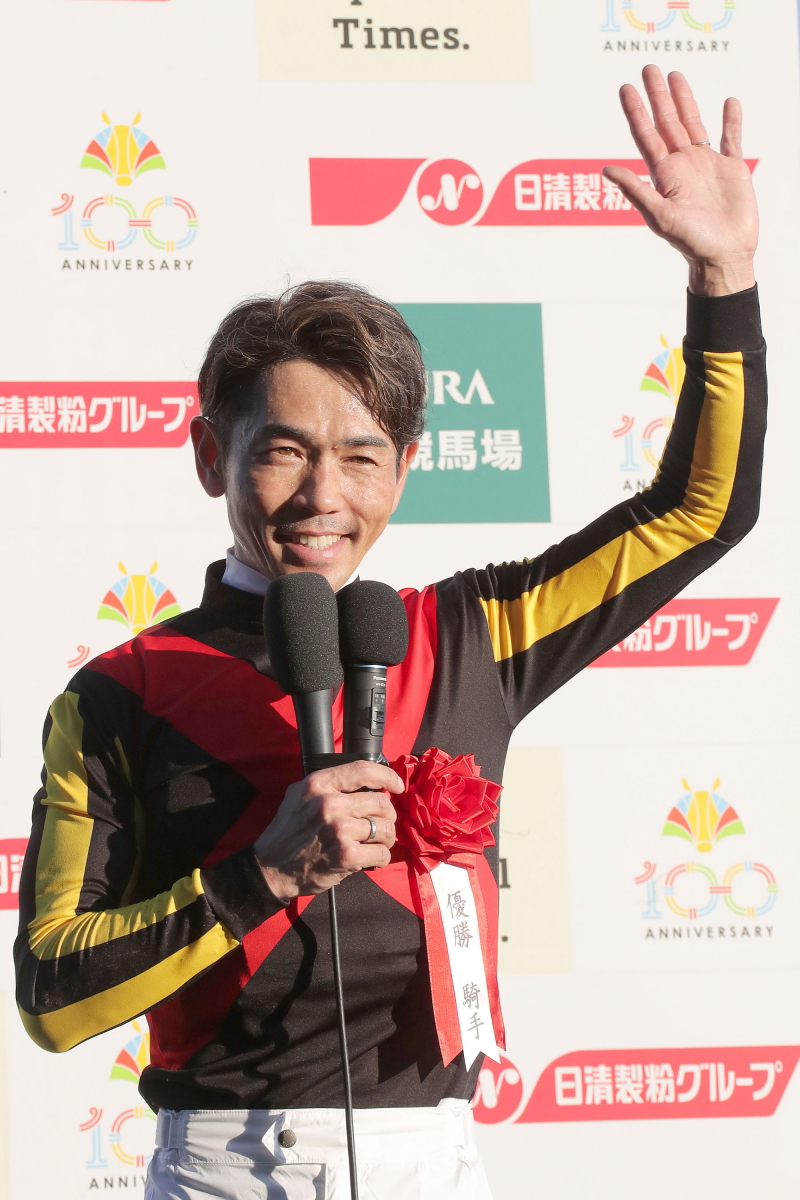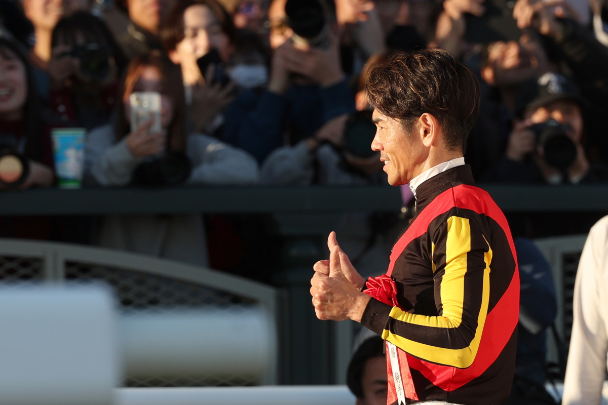 勝利騎手インタビュー後、ポーズを取る戸崎圭太騎手