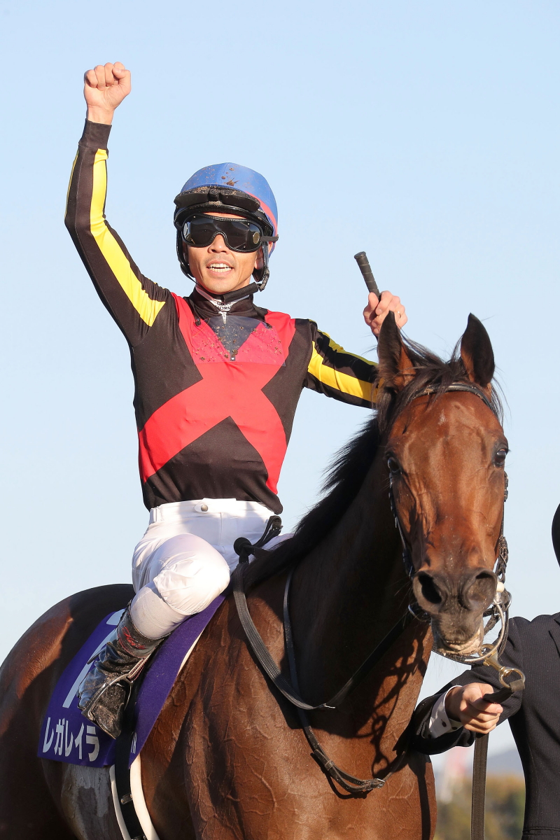 ガッツポーズをみせるレガレイラ鞍上の戸崎圭太騎手
