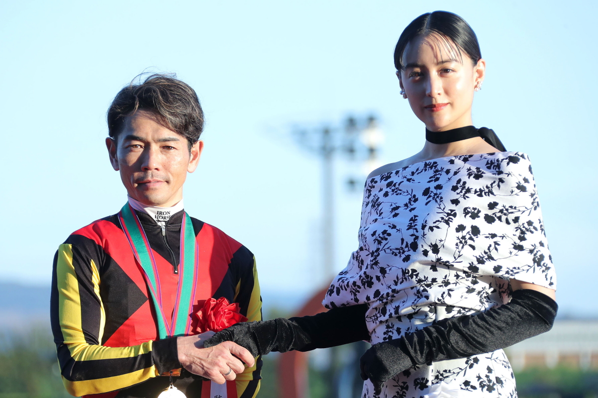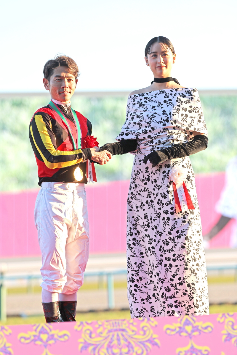 戸崎圭太騎手と握手をするプレゼンターの山本美月