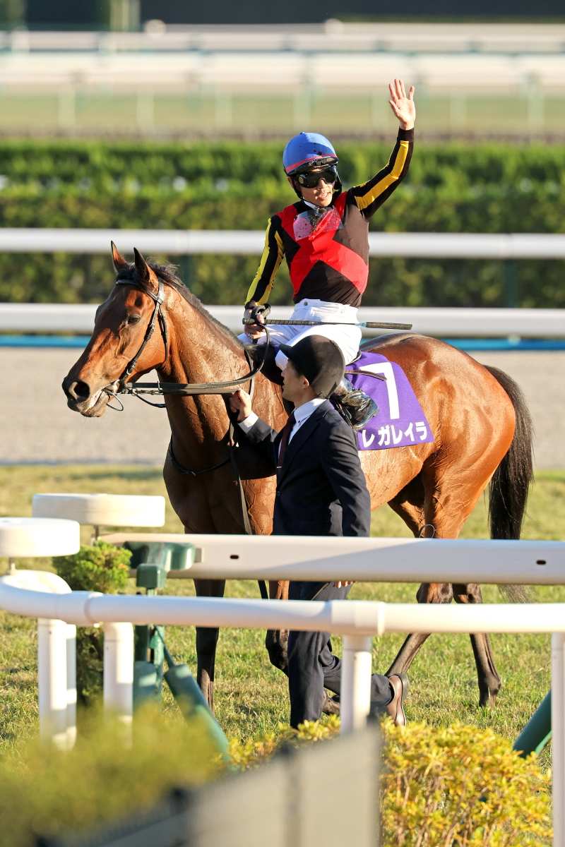 ファンの声援に応えるレガレイラ鞍上の戸崎圭太騎手