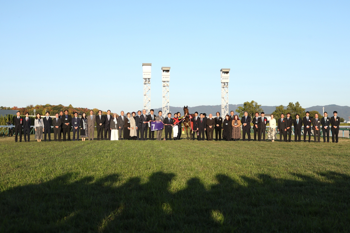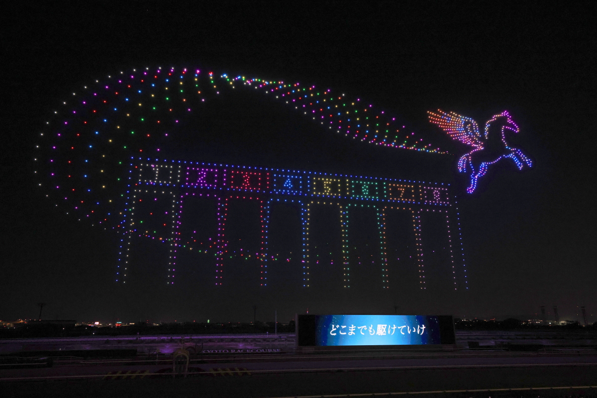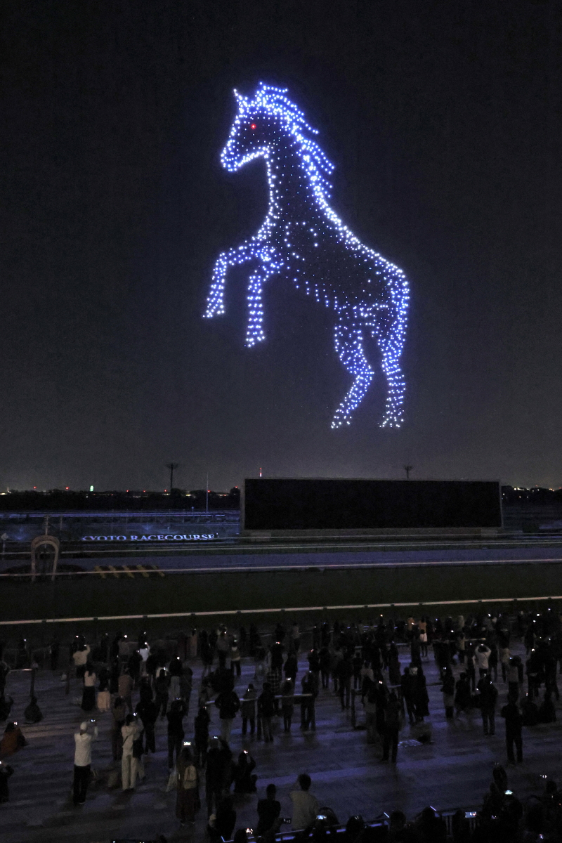 また全レース終了後には、京都競馬場開設100周年記念のドローンショーが行われ、淀のターフ上空を彩った。