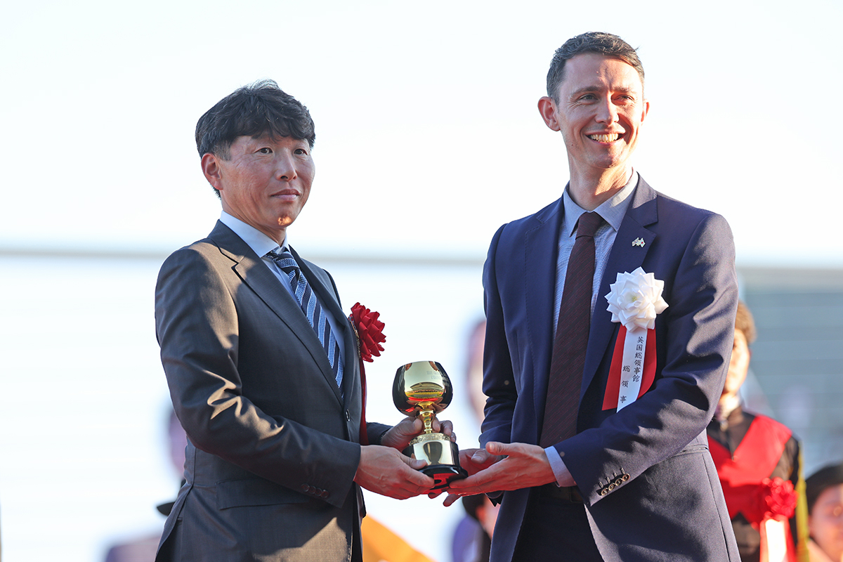 マイケル・リチャード・ブライス 在大阪英国総領事とフォトセッションをおこなう吉田俊介サンデーレーシング代表。同クラブは4年連続でのエリザベス女王杯制覇となった