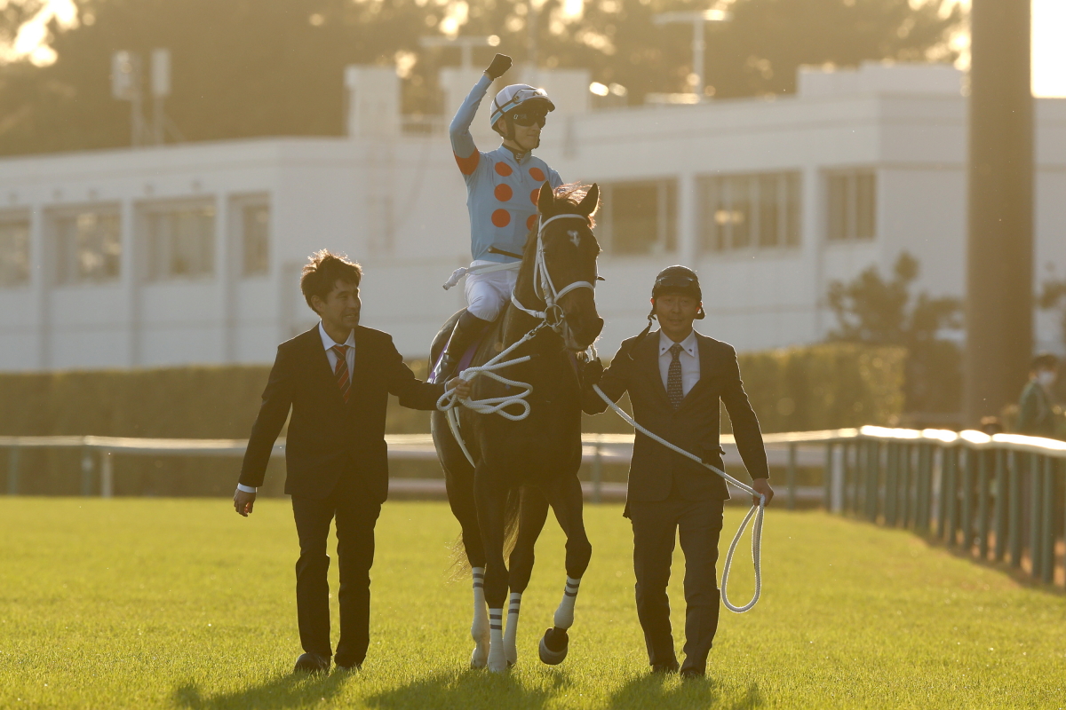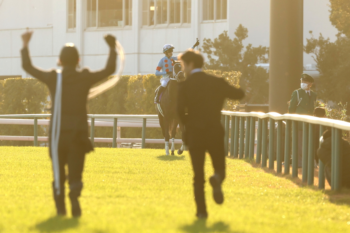 写真判定の末確定し喜ぶ助手・厩務員氏と、ダブルハートボンド鞍上の坂井瑠星騎手