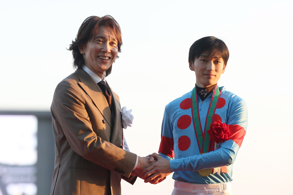 プレゼンターの佐々木蔵之介さんと握手をする坂井瑠星騎手