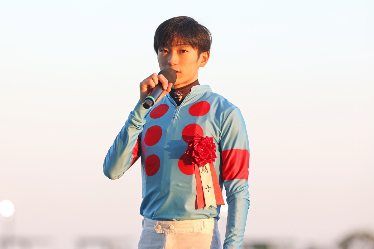 ウィナーズサークルで勝利騎手インタビューに応じる坂井瑠星騎手