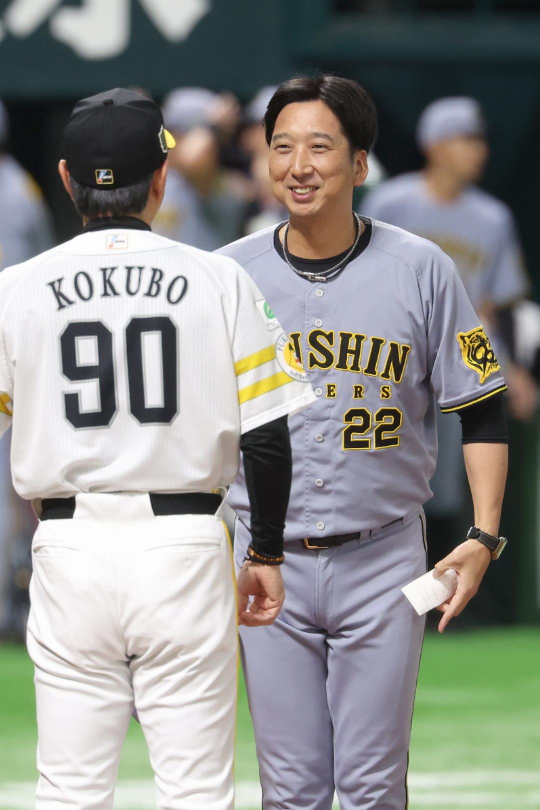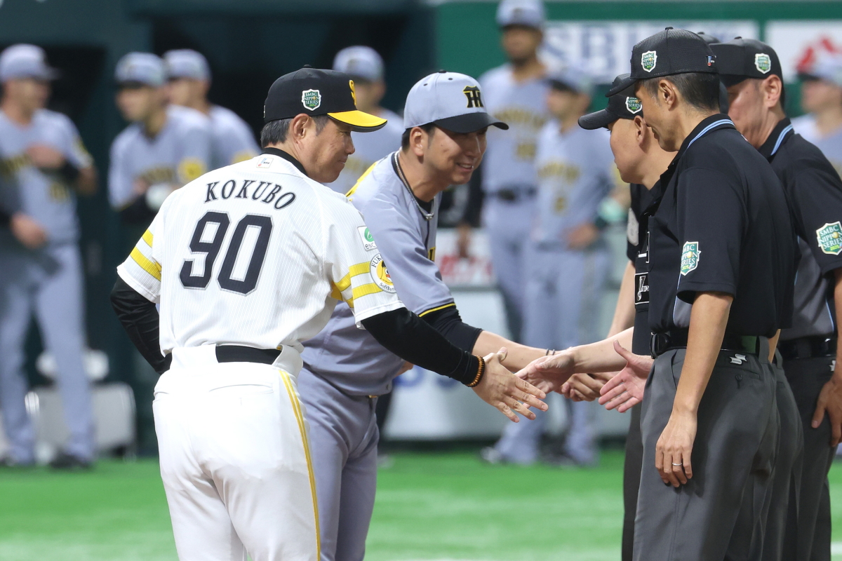 メンバー表交換後、審判団と握手をする藤川球児監督と小久保裕紀監督