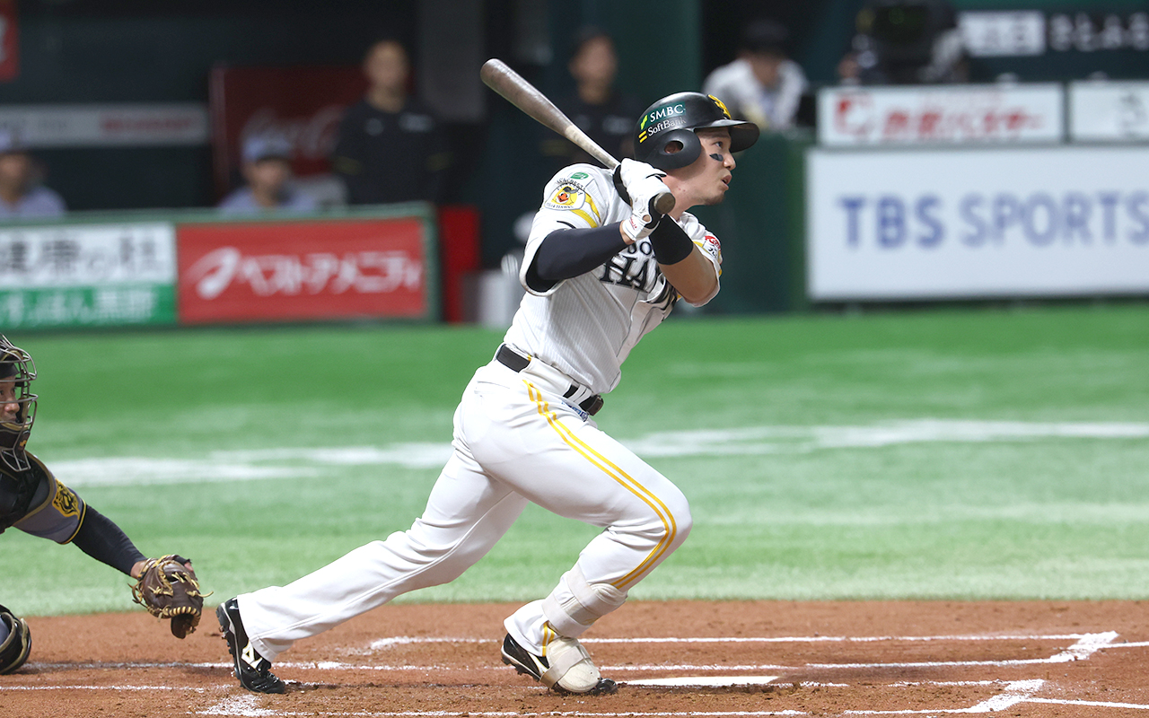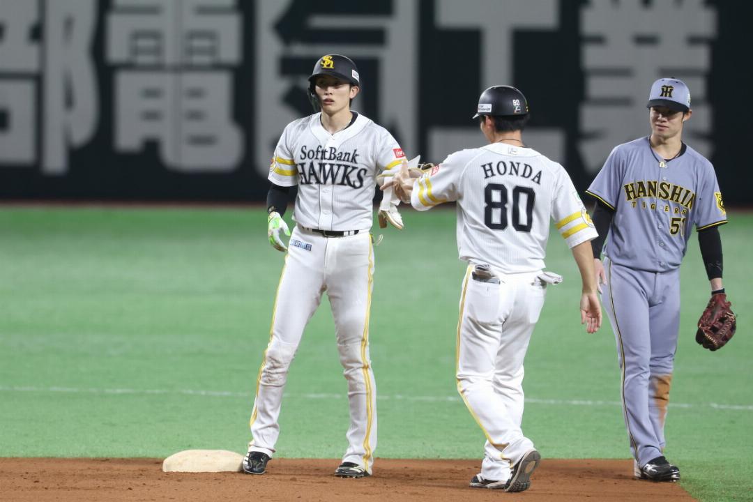 7回裏、レフトへの2塁打を放った周東佑京