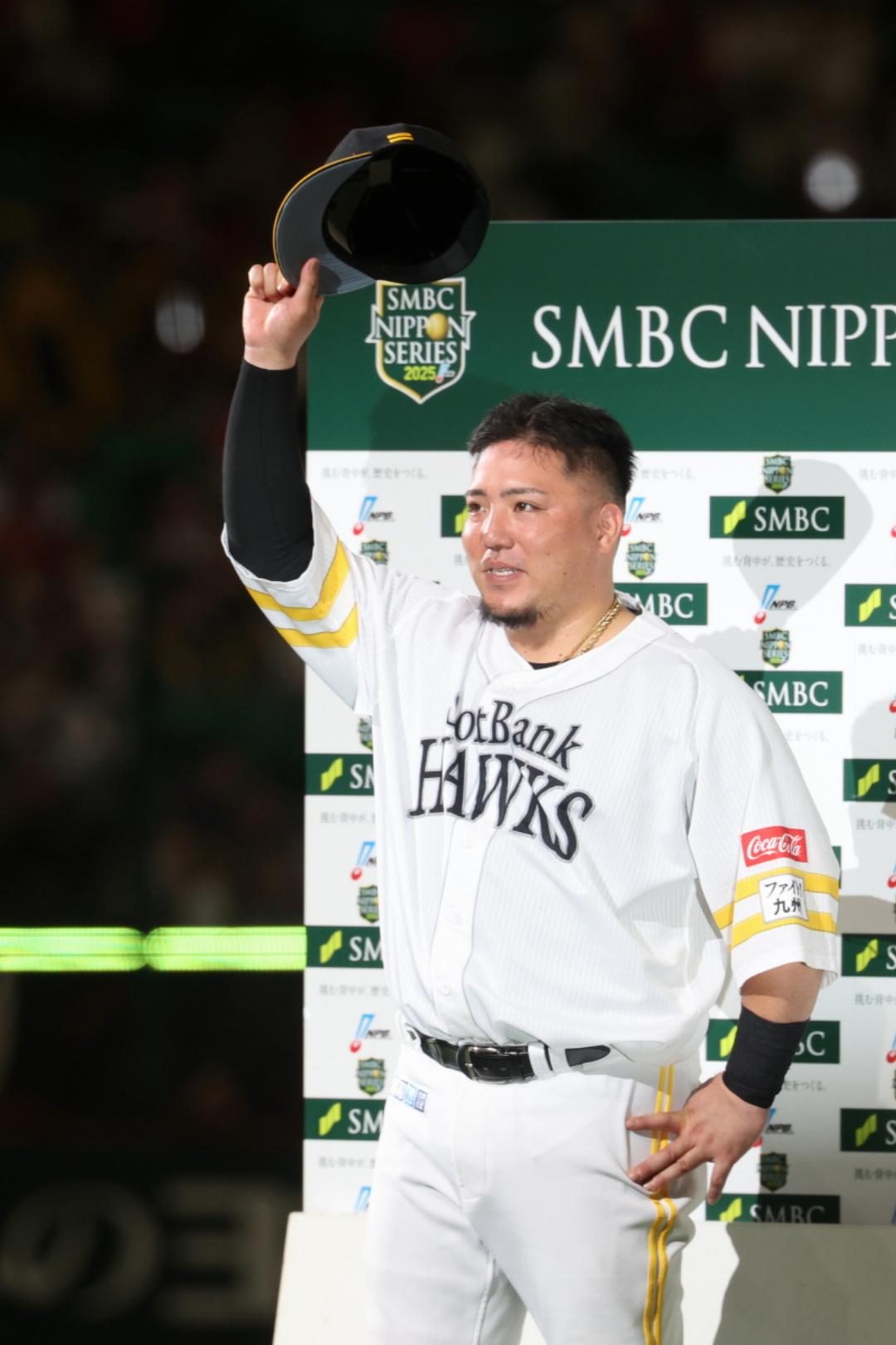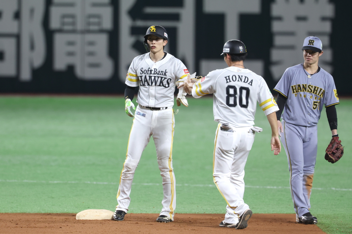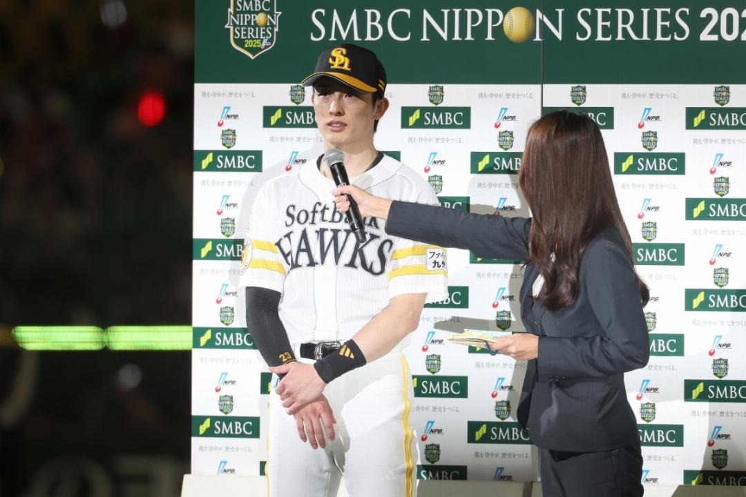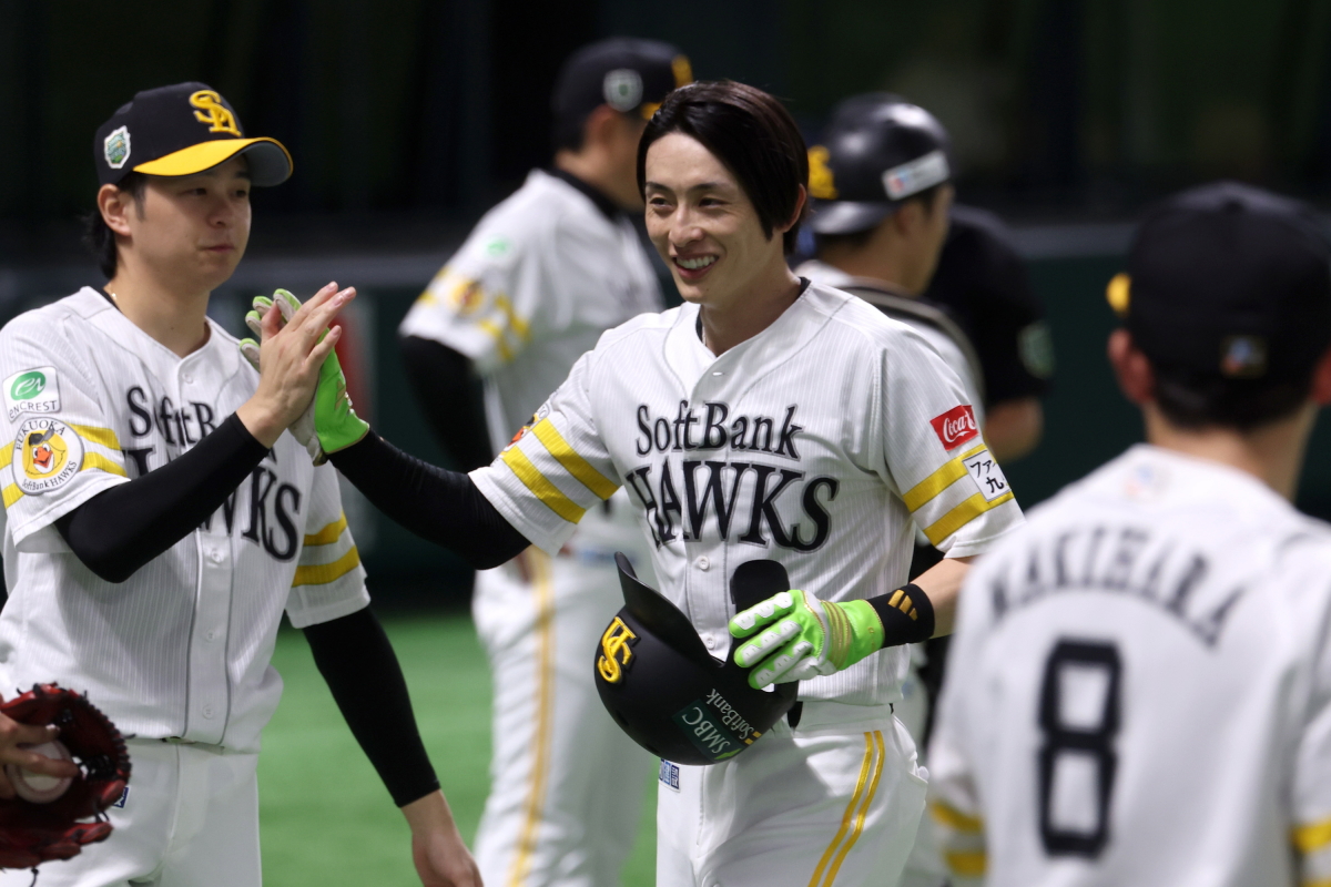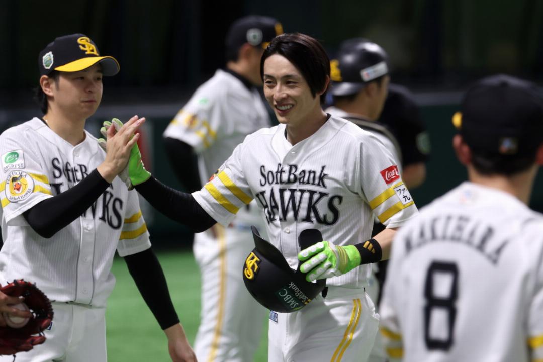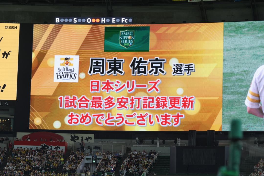 このヒットで5打数5安打とし、日本シリーズ1試合最多安打記録を更新した周東佑京外野手