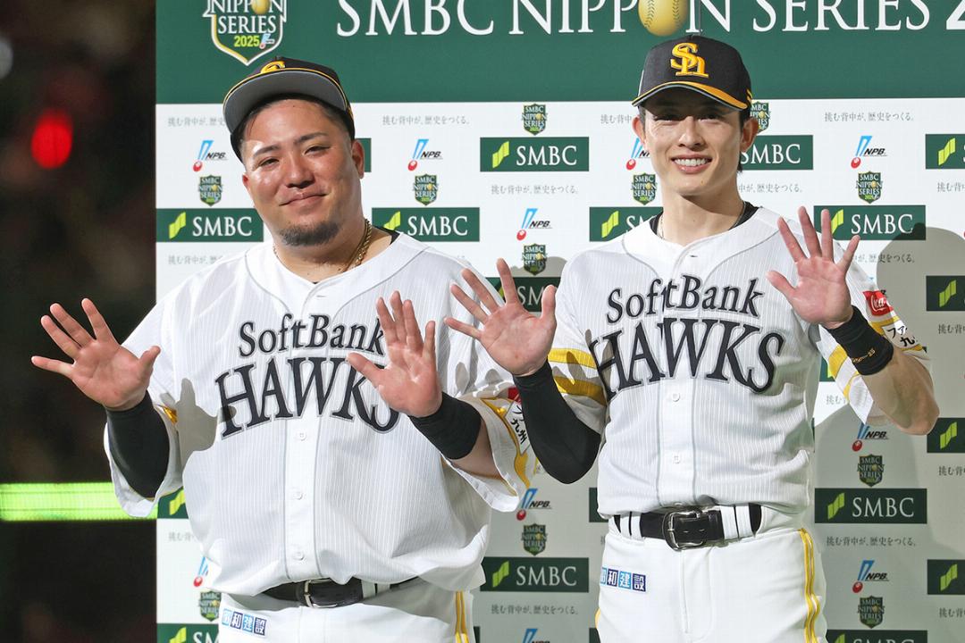 お立ち台で報道陣のカメラに向かってポーズをとる山川穂高(左)と周東佑京