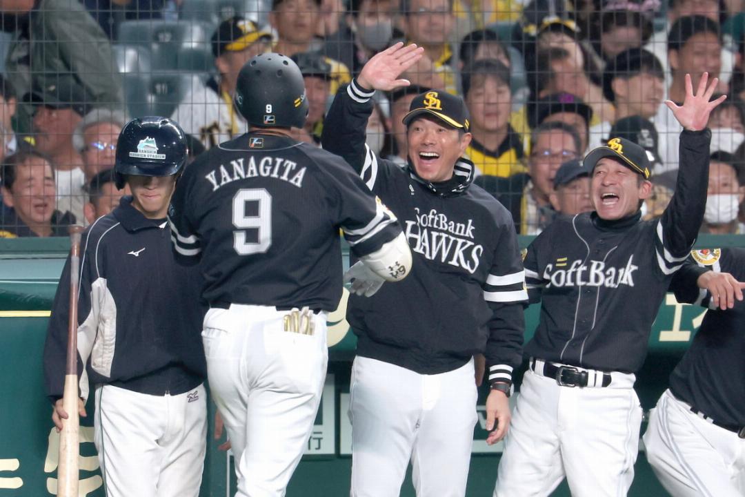同点本塁打を放った柳田悠岐外野手を笑顔で迎える小久保裕紀監督