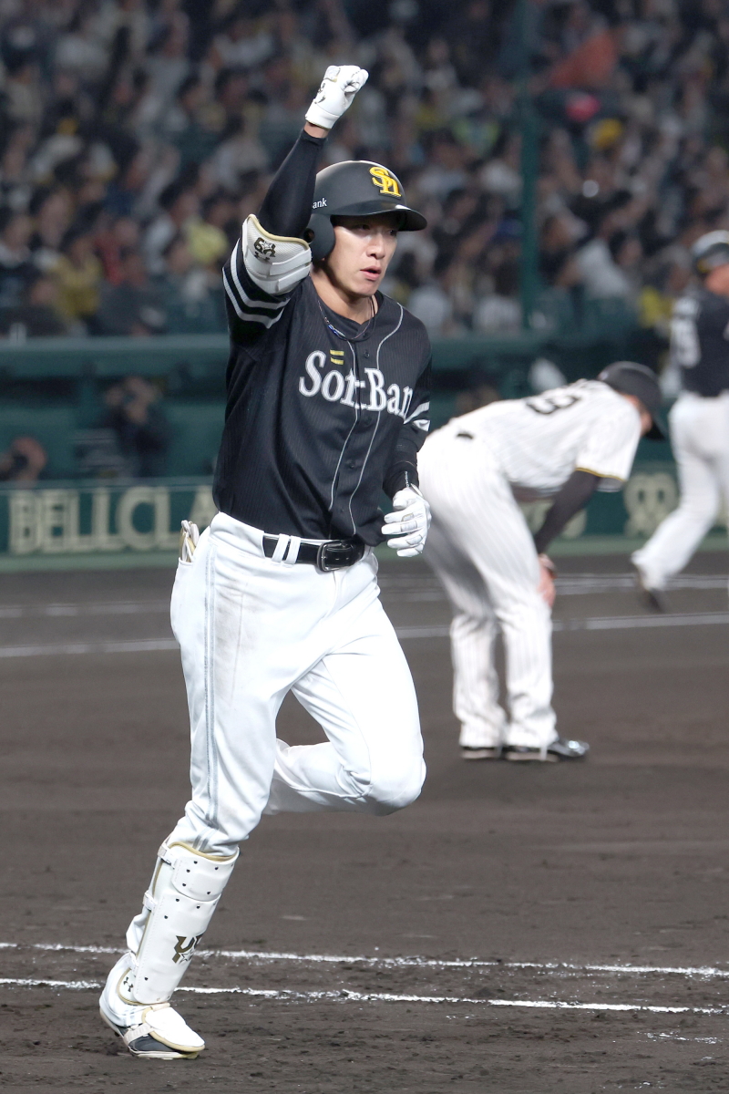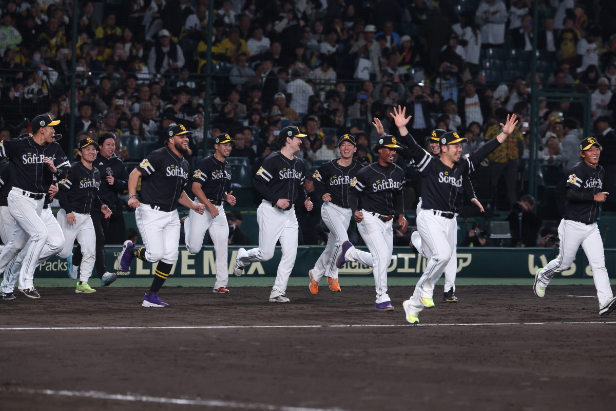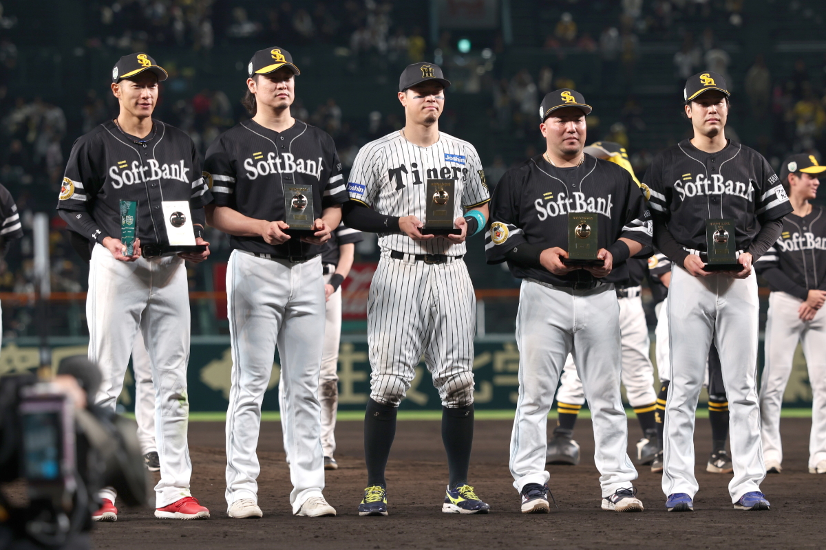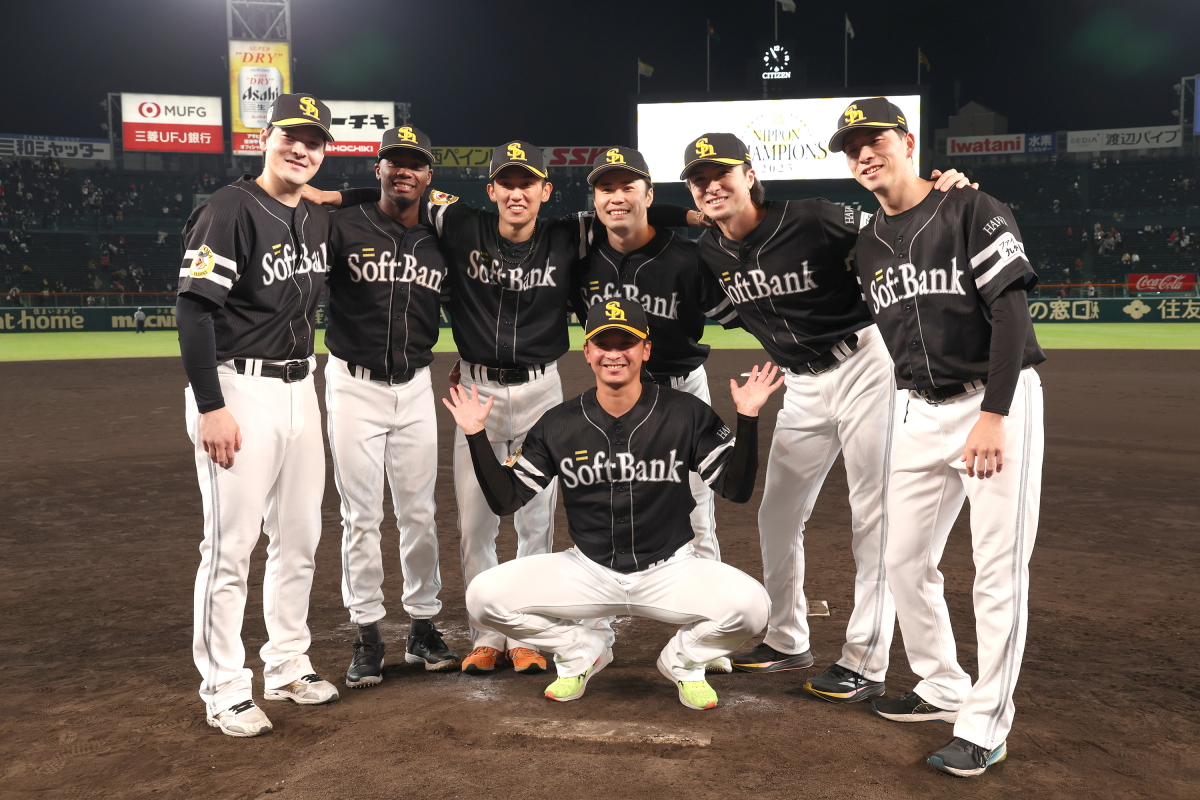 42 Photos10月30日、SMBC日本シリーズ第5戦(阪神甲子園球場)が行われ、福岡ソフトバンクホークスは2点リードされた8回表、柳田悠岐外野手の2点ホームランで追いつき、さらに延長11回表野村勇内野手が決勝ソロホームランを放ち、3-2で阪神タイガースを下し5年ぶり12回目の日本一に輝いた。