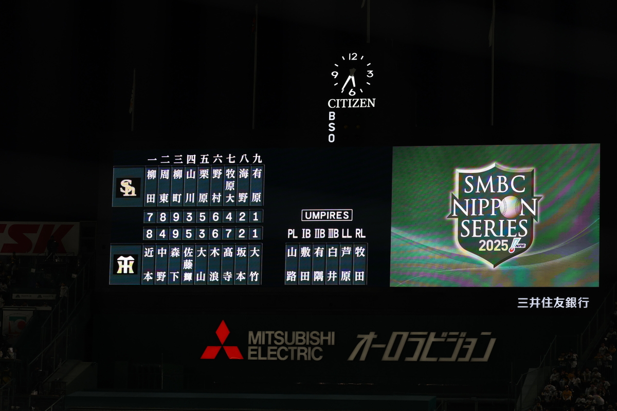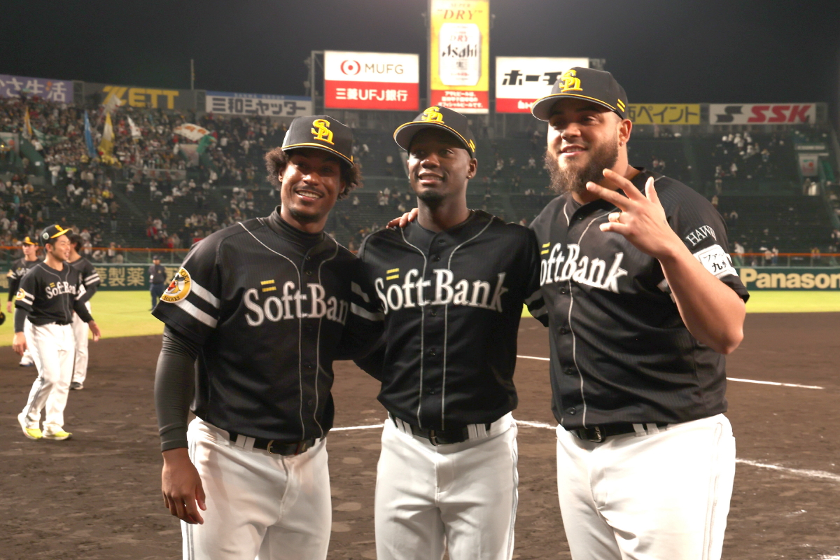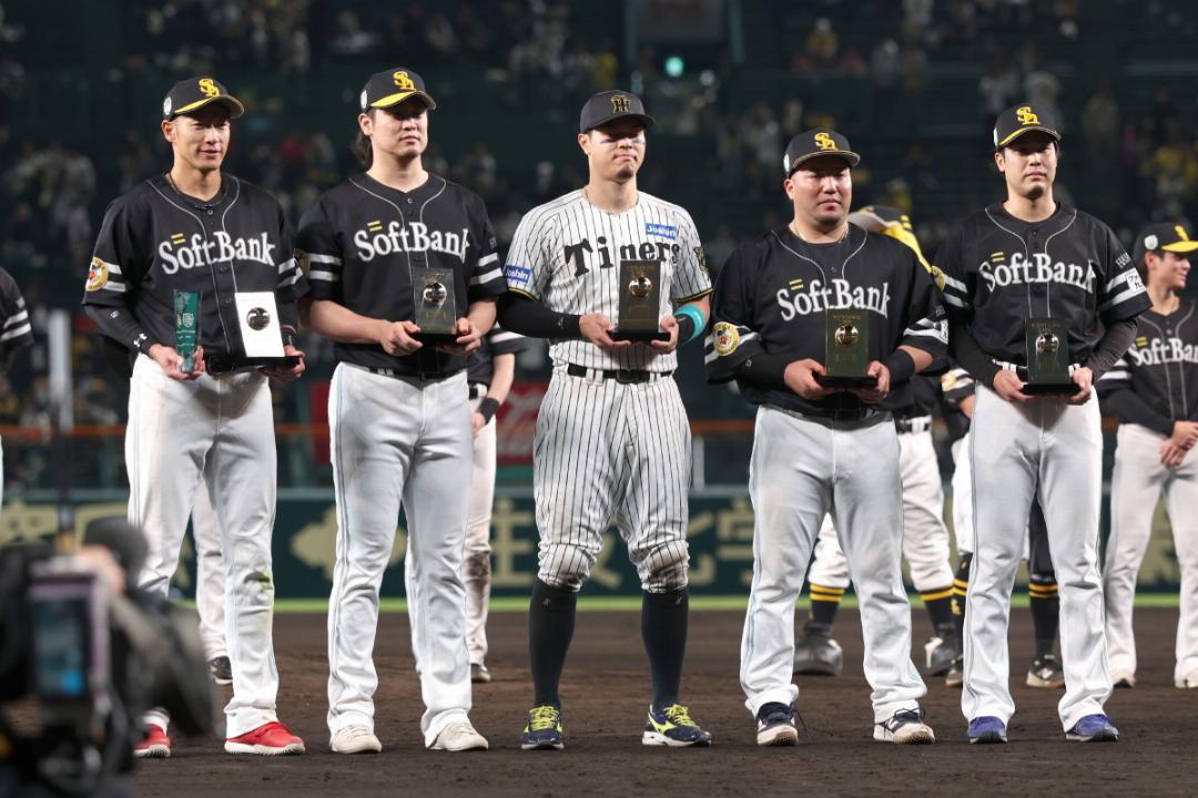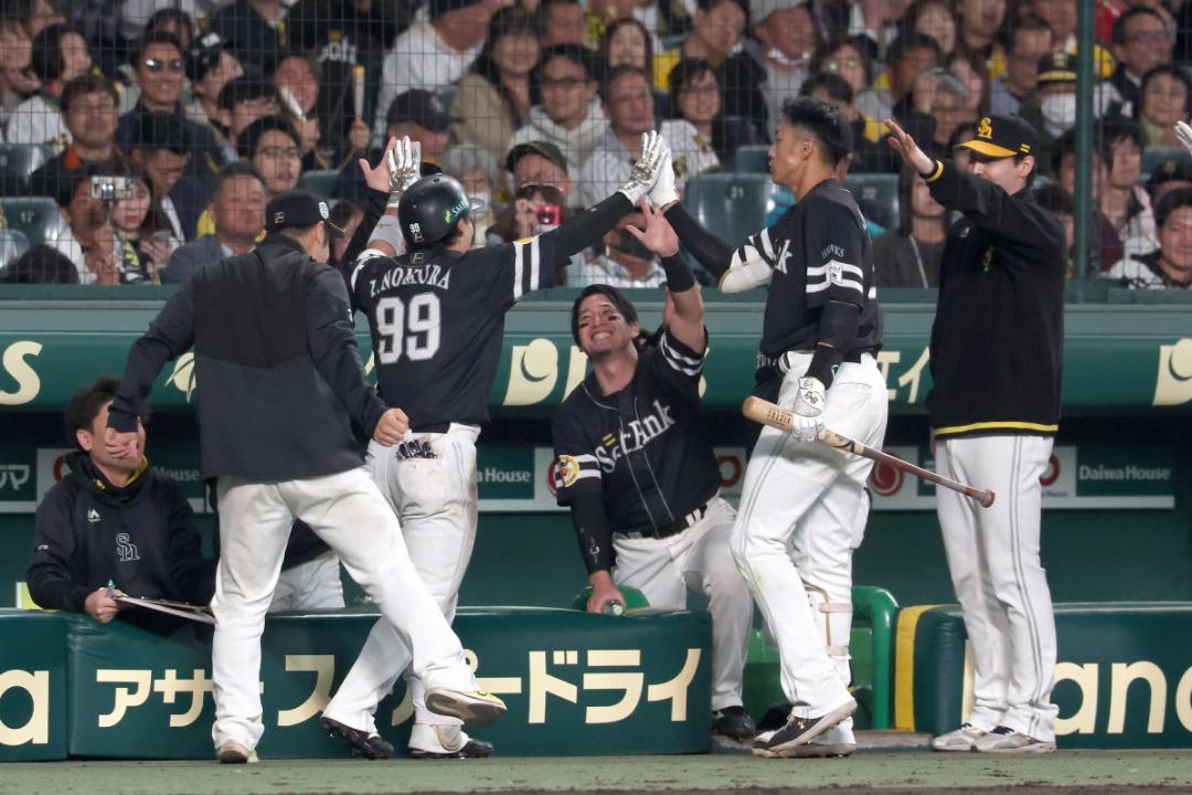 42 Photos10月30日、SMBC日本シリーズ第5戦(阪神甲子園球場)が行われ、福岡ソフトバンクホークスは2点リードされた8回表、柳田悠岐外野手の2点ホームランで追いつき、さらに延長11回表野村勇内野手が決勝ソロホームランを放ち、3-2で阪神タイガースを下し5年ぶり12回目の日本一に輝いた。