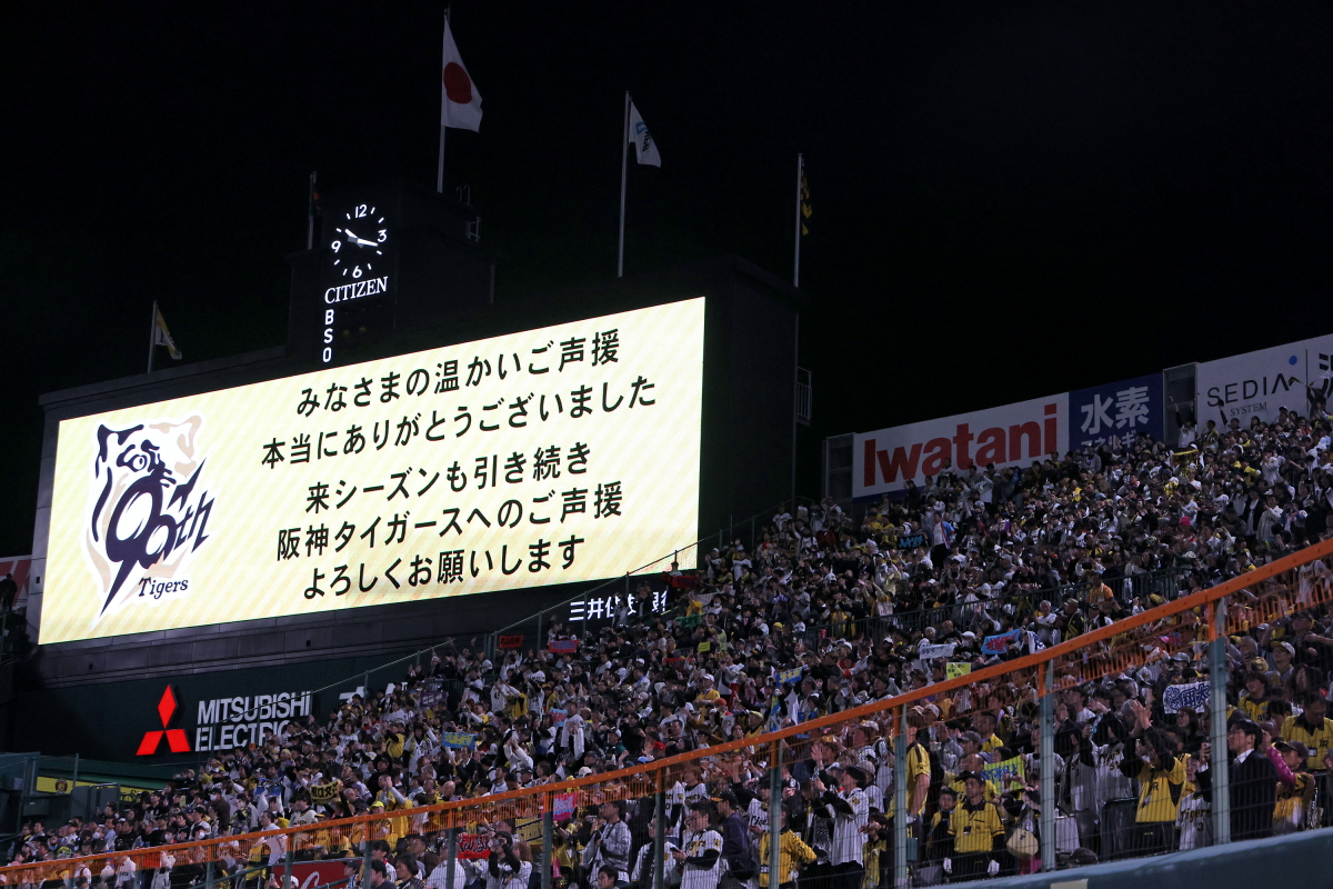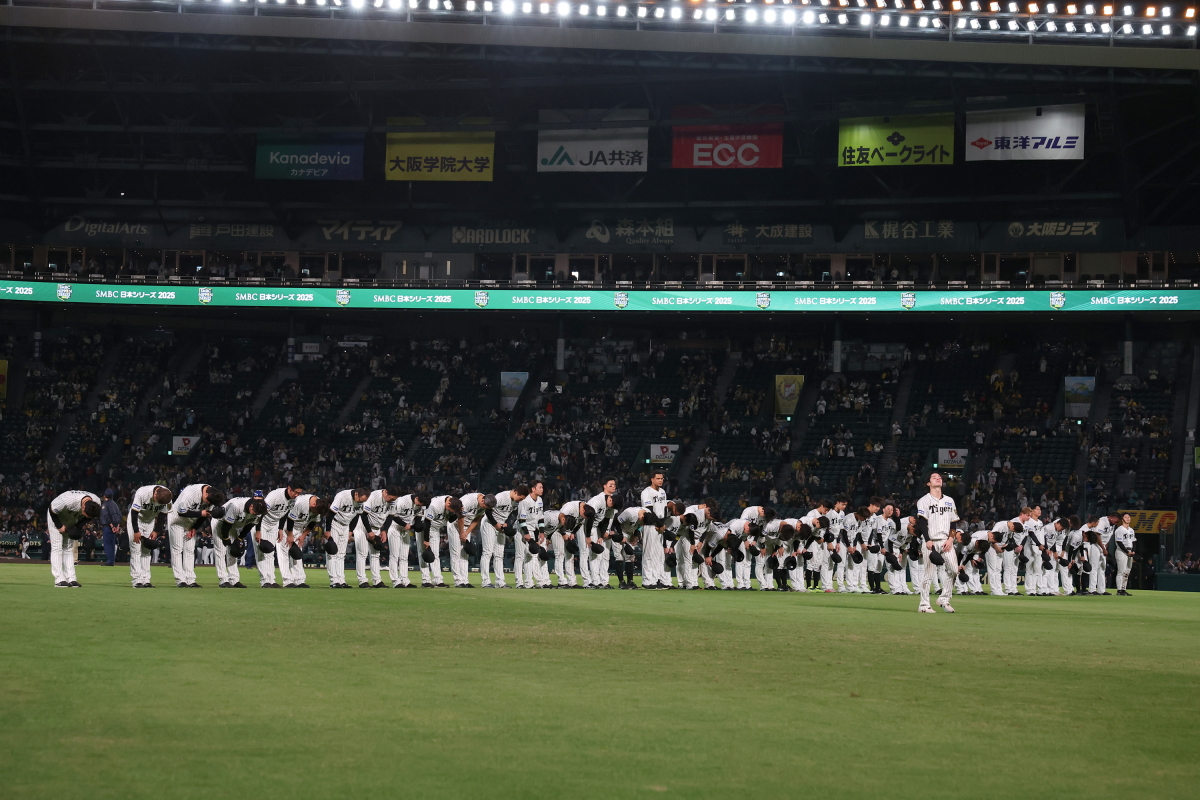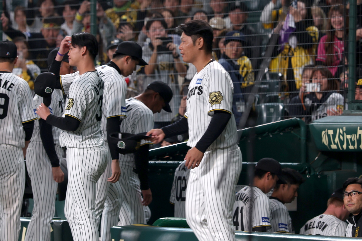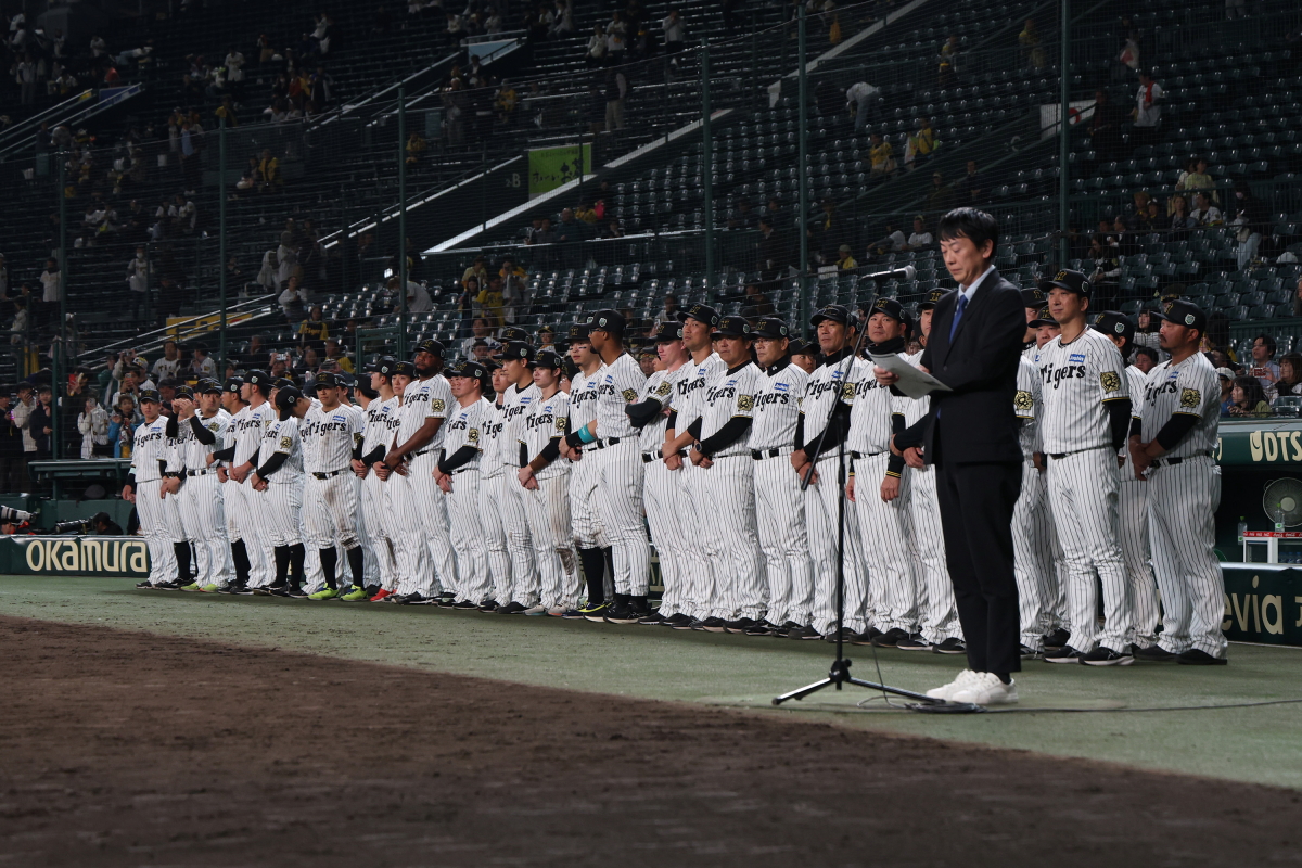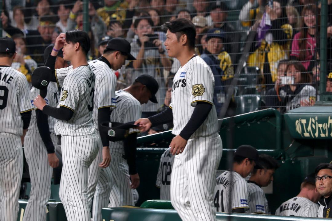 優勝セレモニーを見つめる阪神タイガースナイン。甲子園で1度も勝てず3連敗を含む4タテを喫した