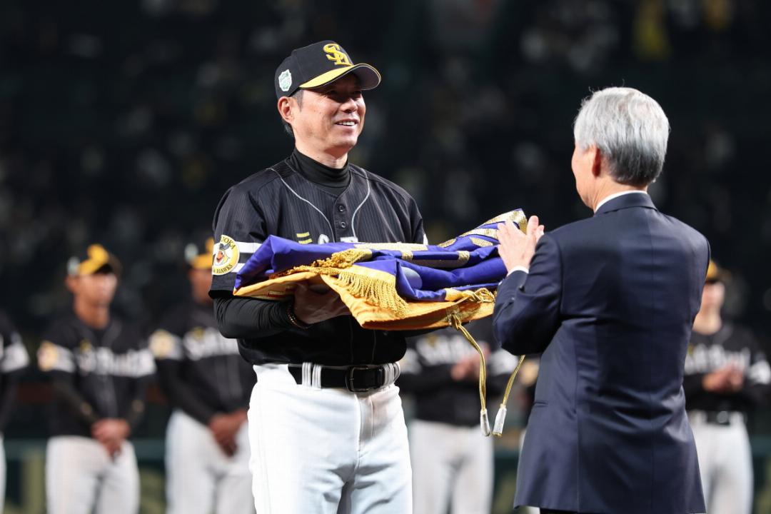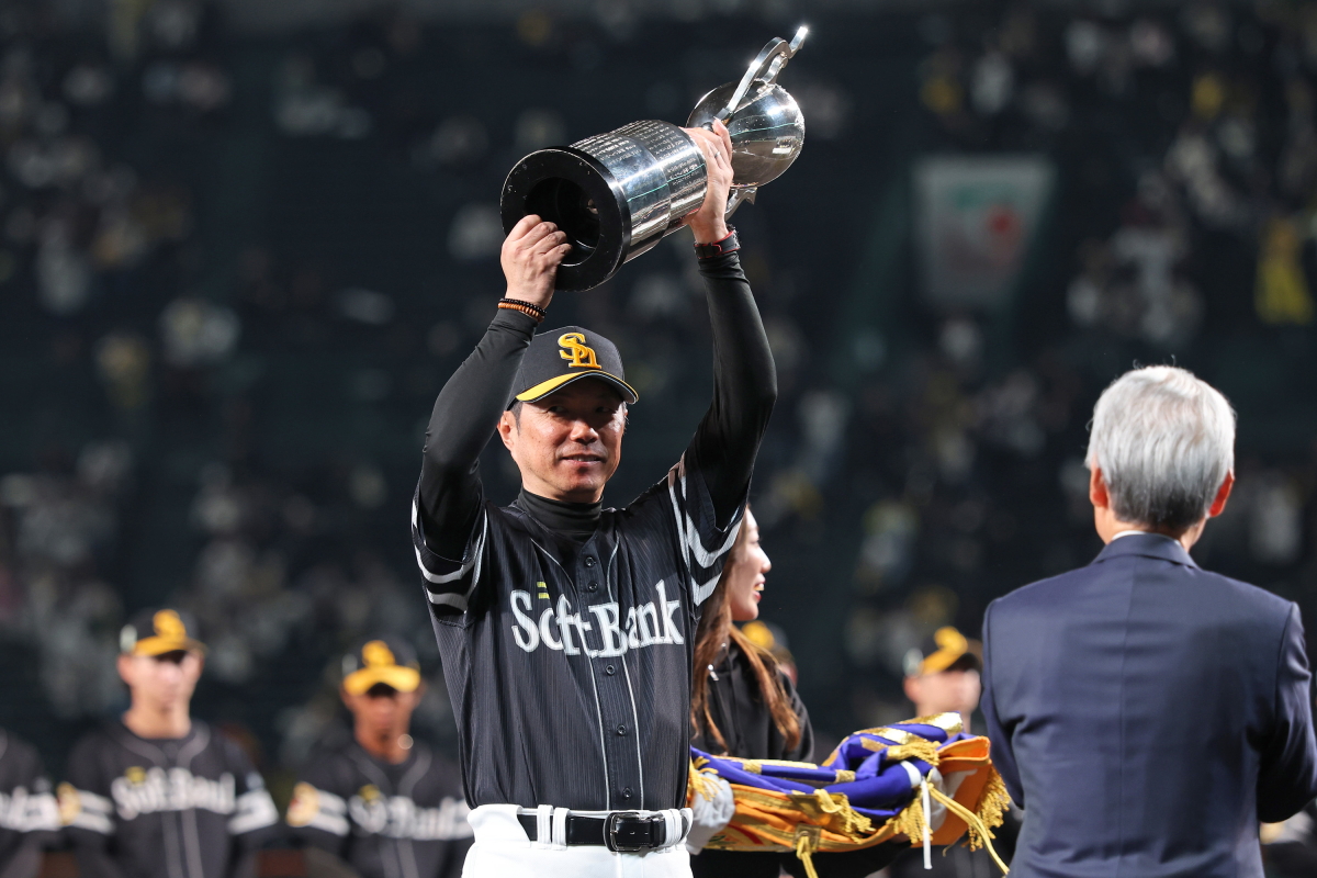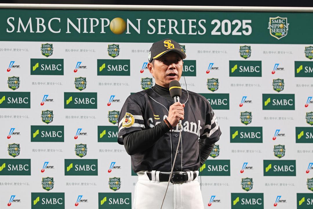 優勝監督インタビューを受ける、福岡ソフトバンクホークス小久保裕紀監督