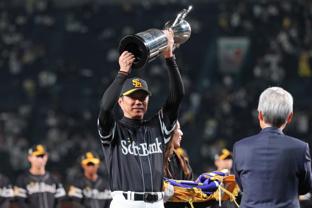 優勝トロフィーを受け取り掲げる小久保裕紀監督