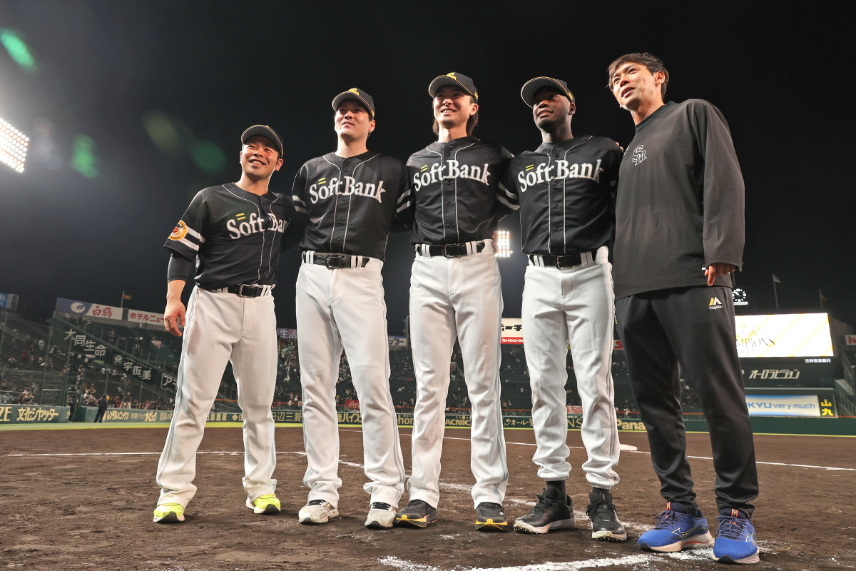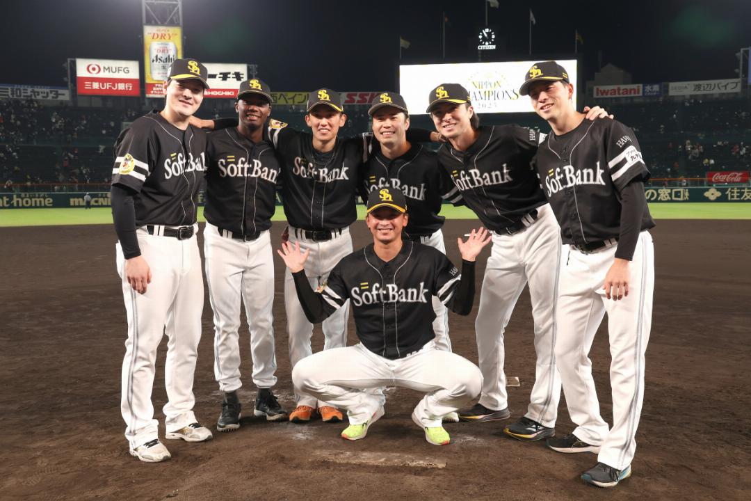 スタッフを交えて集合撮影をおこなう福岡ソフトバンクホークスナイン