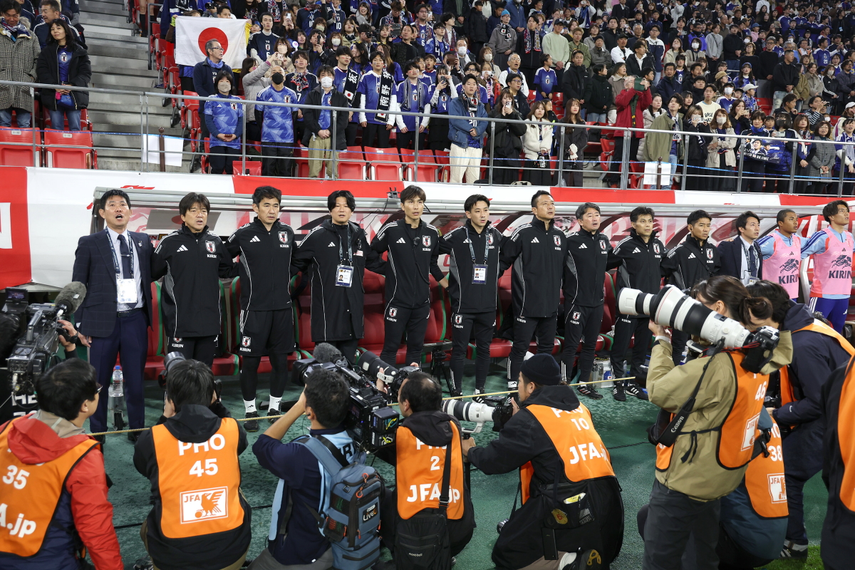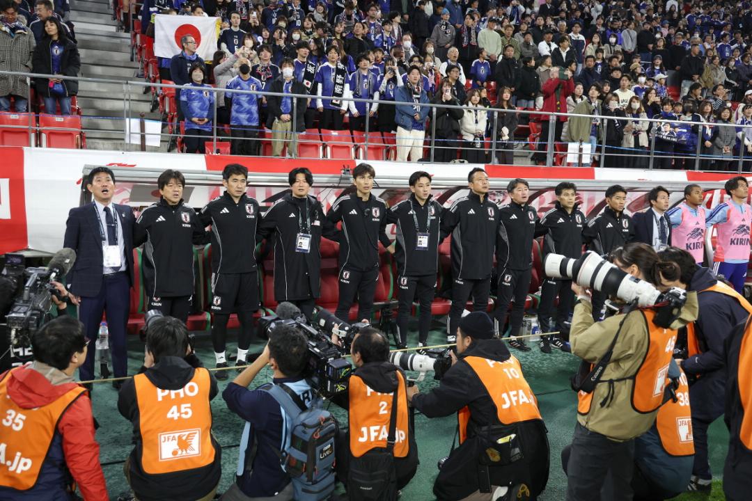 国歌斉唱をおこなう森保一監督(左)ら日本代表スタッフ陣