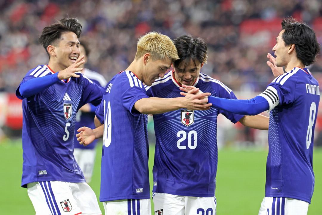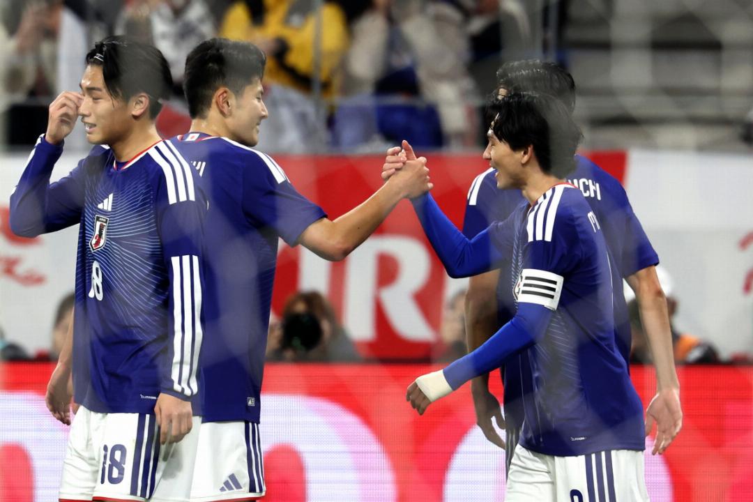 ゴールを決めた堂安律へ駆け寄る久保建英ら