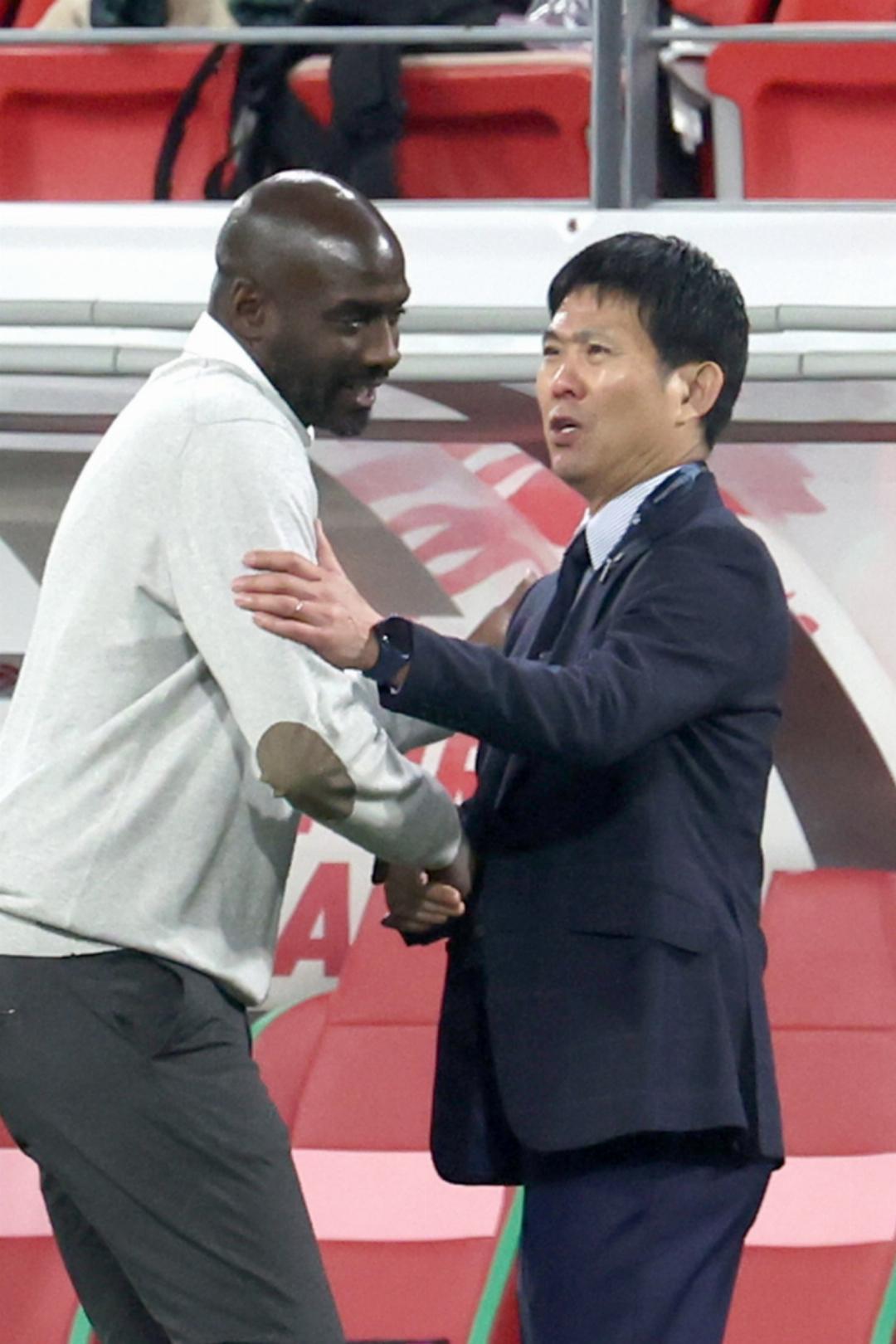 後半30分、選手交代でベンチに下がる南野拓実と握手をする森保一監督
