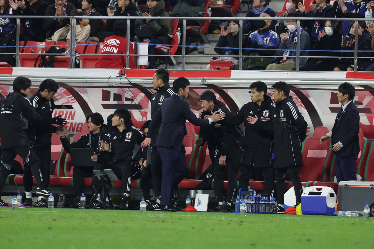 後半23分に2選手を交代したのち、後半30分には一気に3選手を交代させた森保一監督(右)