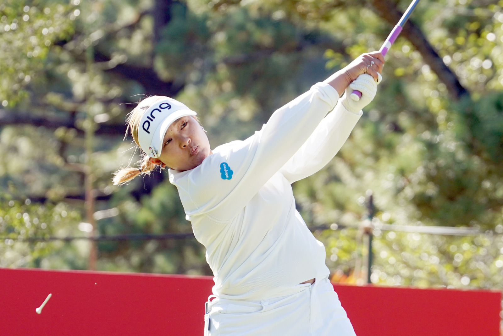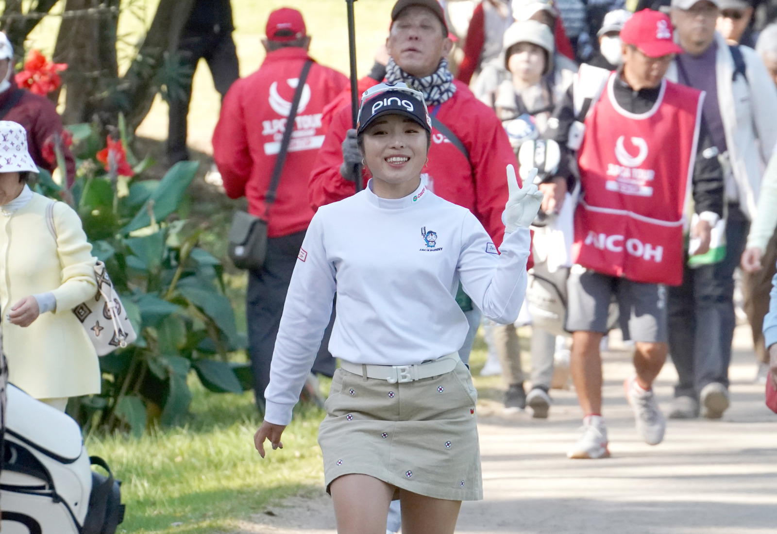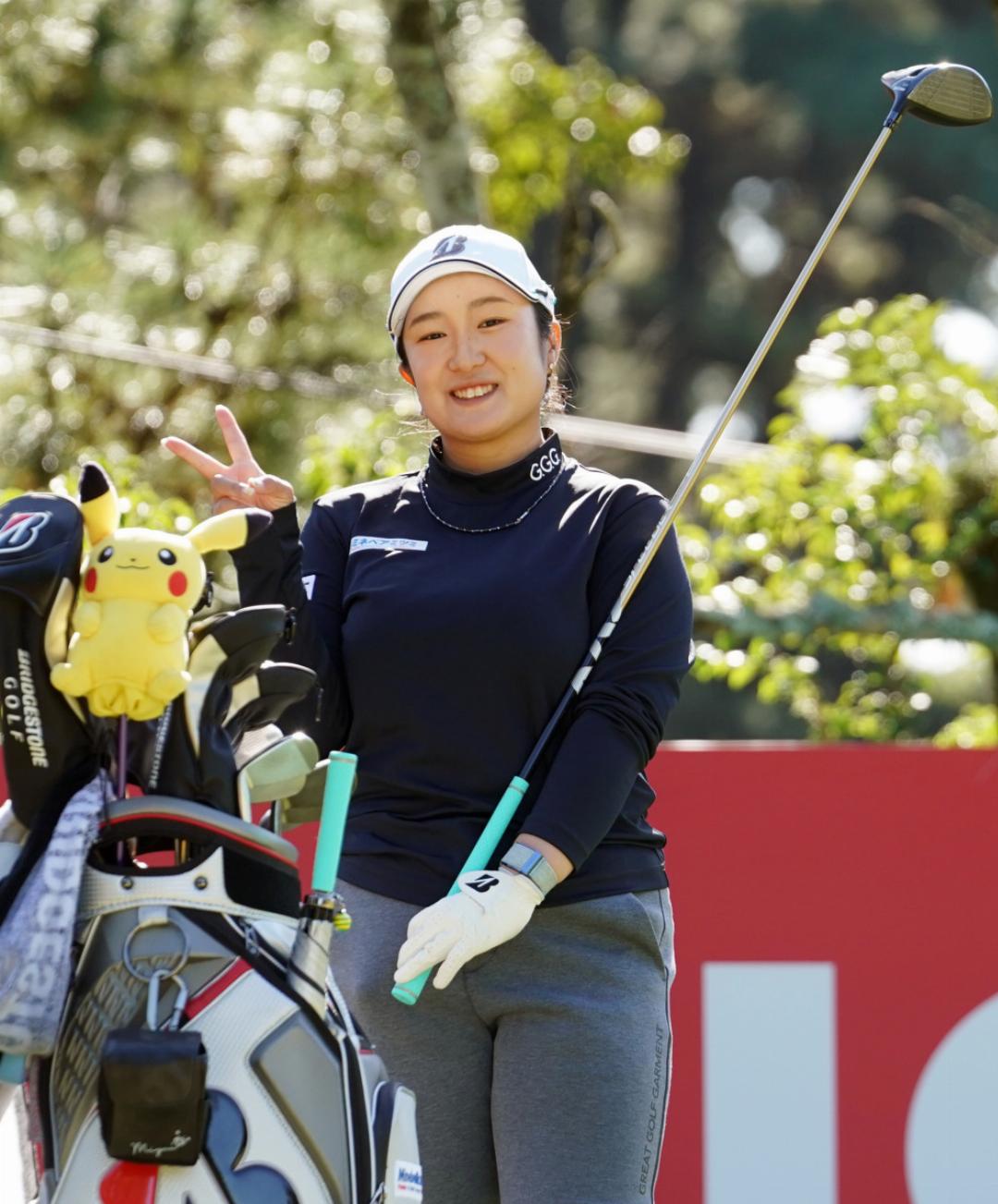 貫禄のVサインを見せるのは今シーズンの年間女王、佐久間朱莉。この日はスコアを1つ落としてしまい、14位タイ