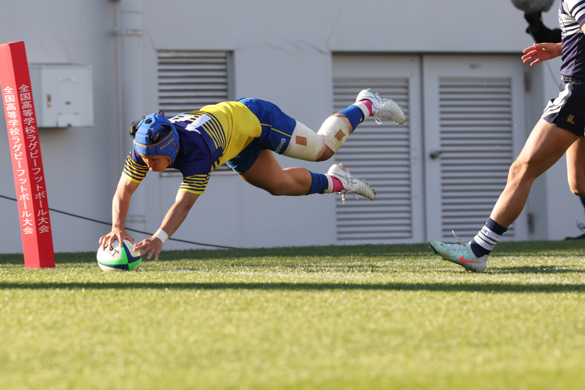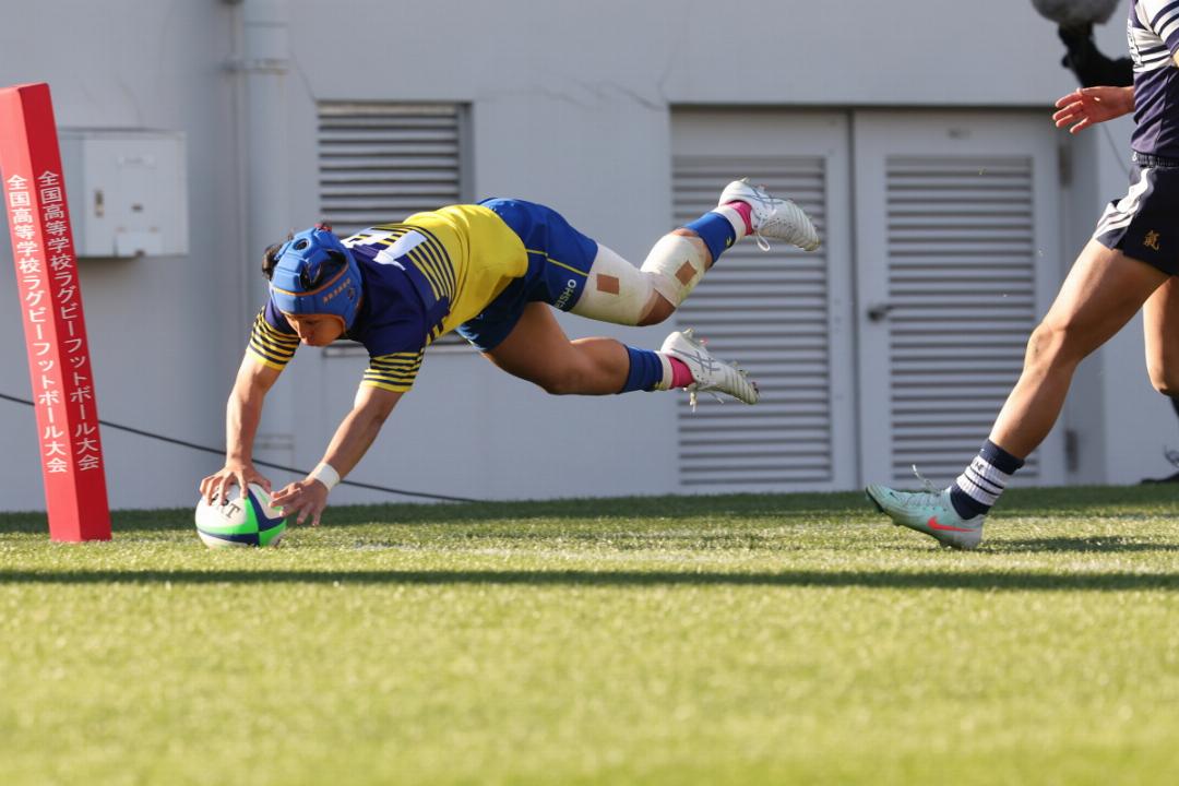 京都成章も後半26分、ボールを受けたフッカー米本啓太朗が右隅にトライを決める