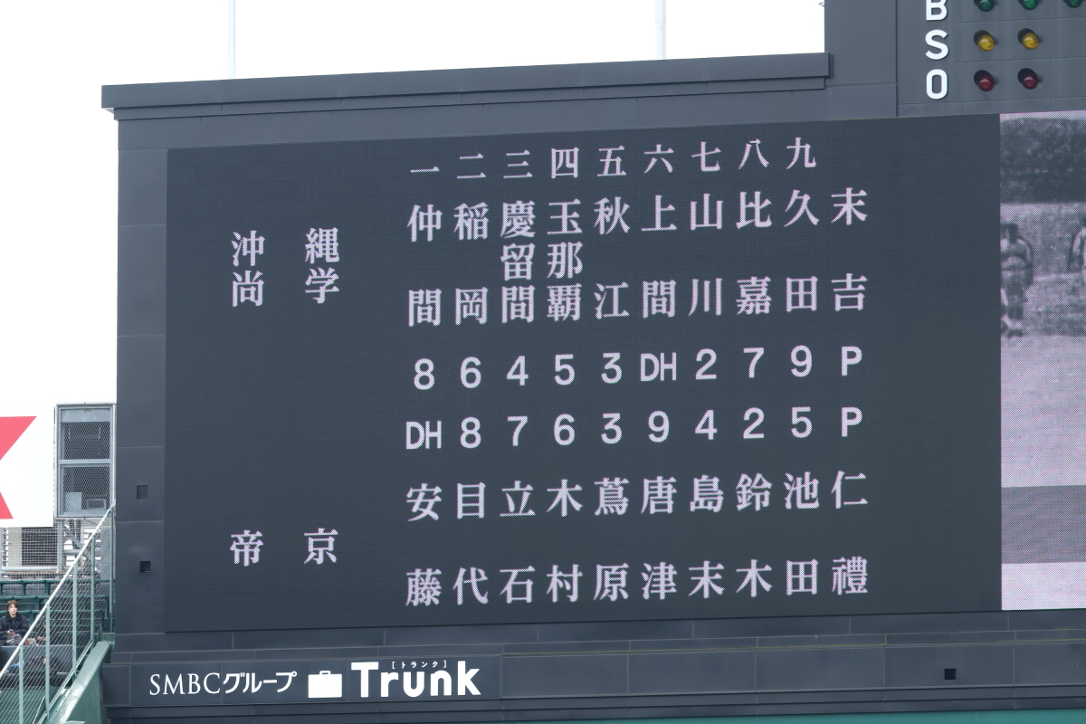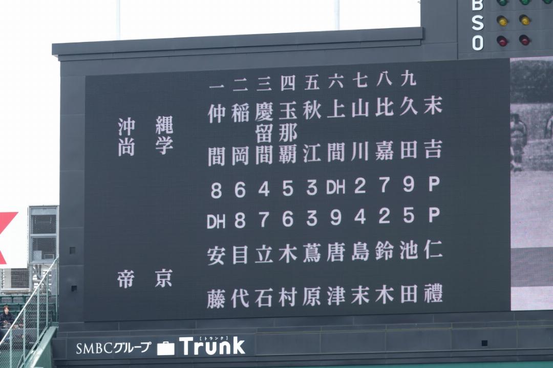 開会式後の第一試合は、前年夏の優勝校沖縄尚学(沖縄)と16年ぶりの15回目の帝京(東京)との対戦。そして指名打者(DH)制が導入された高校野球甲子園最初の試合となった
