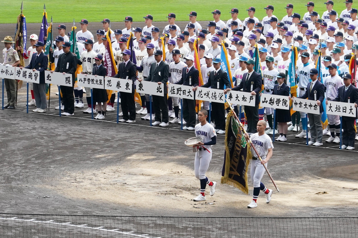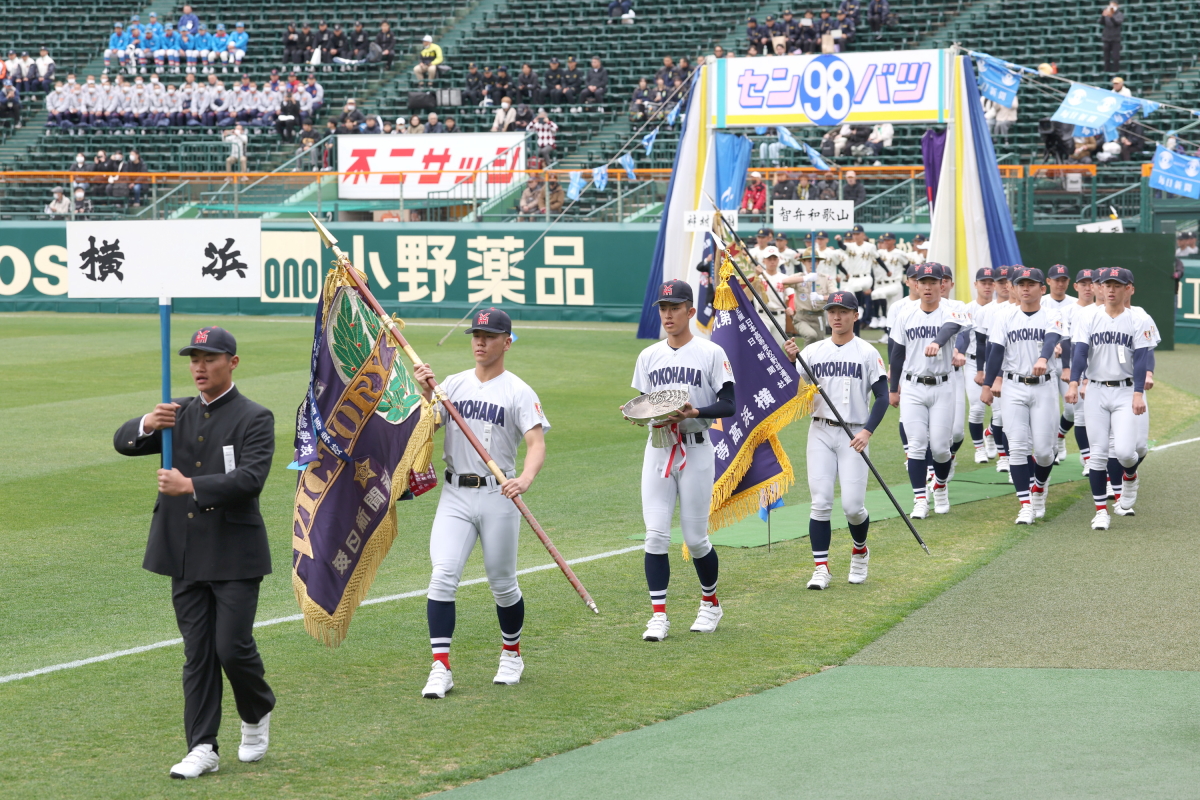 前年の優勝校横浜を先頭に入場行進をおこなう出場校ナイン