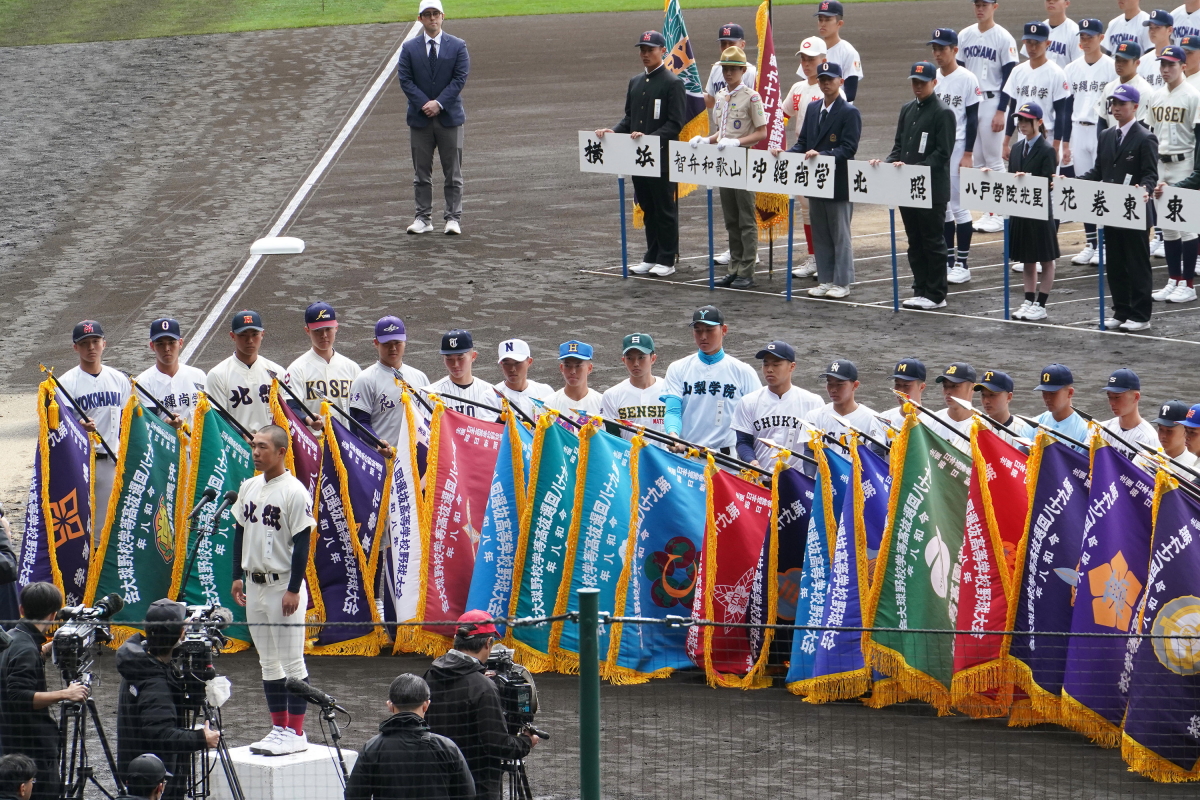 選手宣誓をおこなう北照(北海道)の手代森煌斗主将と、校旗を持つ各校主将ら